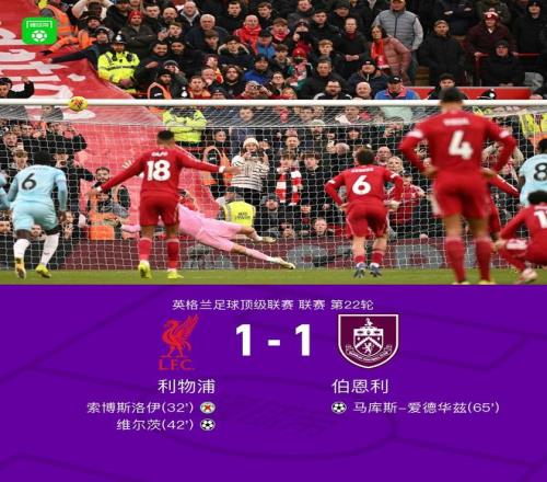 北京时间1月17日,英格兰足球顶级联赛第22轮,利物浦主场对阵伯恩利。比赛中,加克波造点,索博斯洛伊主罚点球击中横梁,维尔茨乱战破门,马库斯-爱德华兹扳平比分。最终,双方1-1战平。